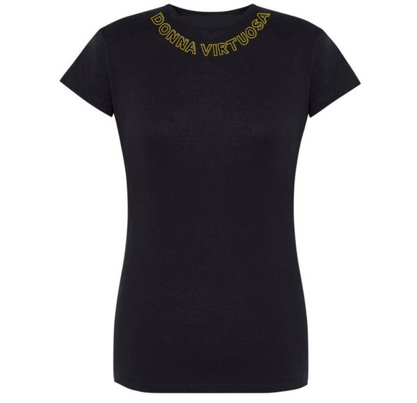 T-shirt bianca con strass argento e bordo nero T-shirt nera con strass neri e bordo oro